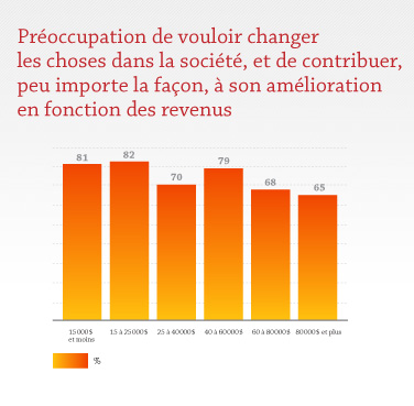 À l'inverse, et c'est ce qui est le plus désolant, cette préoccupation de changer des choses et de contribuer à l'amélioration de la société diminue avec les revenus des répondants, ce qui démontre une fois de plus l'individualisme, l'égoïsme et « l'engourdissement » que provoque l'argent. Ce constat confirme également le grand paradoxe voulant que l'amélioration des conditions individuelles se fasse toujours au détriment des conditions collectives, comme si l'argent était allergique à l'empathie, à la sensibilité et à la solidarité.